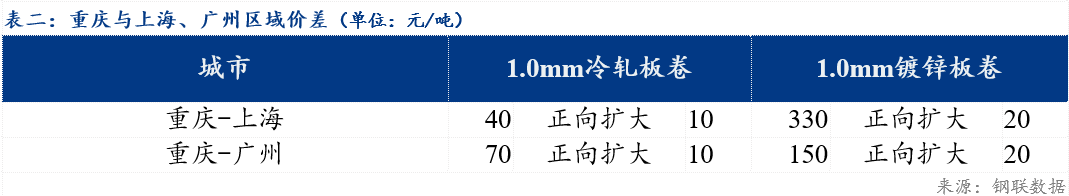 重庆、上海地区冷轧板卷区域价差扩大10元/吨;重庆、广州冷轧板卷区域价差扩大10元/吨。重庆、上海镀锌板卷区域价差扩大20元/吨;重庆、广州镀锌板卷区域价差扩大20元/吨。镀锌、冷轧品种价差维持不变;镀锌、热轧品种价差扩大10元/吨;冷轧、热轧品种价扩大10元/吨。