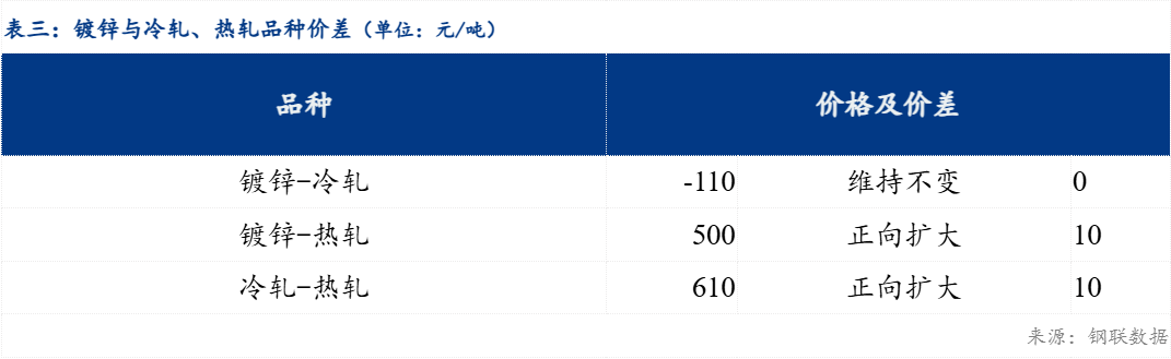 区域价差来看,天津-沈阳冷轧板卷区域价差反向扩大10元/吨,沈阳-哈尔滨冷轧板卷区域价差维持不变,沈阳-大连冷轧板卷区域价差维持不变;天津-沈阳镀锌板卷区域价差维持不变,沈阳-哈尔滨镀锌板卷区域价差维持不变 ,沈阳-大连镀锌板卷区域价差维持不变。品种价差来看,镀冷品种价差维持不变 ;镀热品种价差扩大10元/吨;冷热品种价差扩大10元/吨。