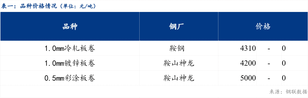 沈阳市场冷轧镀锌价格整体持稳运行,现东北主流市场冷轧板卷价格4310元/吨,镀锌板卷价格4200元/吨,彩涂板卷价格5000元/吨。 具体来看,当前东北地区终端需求表现一般,市场交投氛围冷清,叠加近期市场价格走弱的因素,市场出货不畅,现阶段钢厂资源持续入库,而贸易商销售压力依旧存在,出库速度缓慢,冷轧库存资源仍处于累库阶段 。从区域价差来看,近期东北地区冷轧价格与华北区域现货价格区域价差扩大10元/吨,价差基本保持在180元/吨左右。