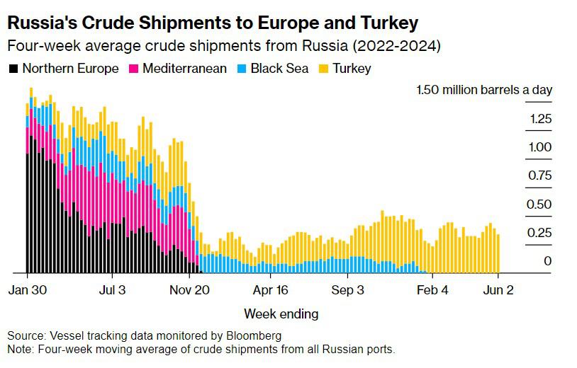 土耳其目前是俄罗斯西部港口原油短途运输的唯一终端市场,截至6月2日的28天内原油出口运输流量下滑至每天仅仅约34万桶。