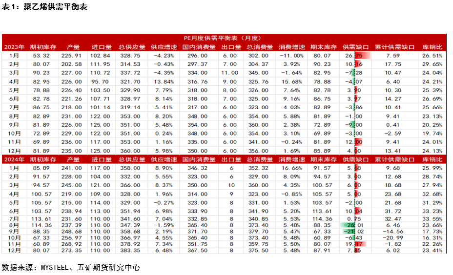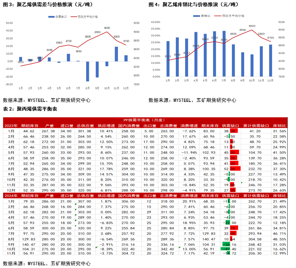 在供应方面,聚乙烯下半年计划新增的410万吨产能中,包括6月的90万吨、9月的105万吨和12月的215万吨。然而,裕龙石化的185万吨产能投产的可能性较低,且仅12月新时代高分子材料的25万吨产能为LLDPE,对市场影响较小。根据供需平衡表的推演,预计三季度供给端将偏紧,而四季度末随着新增产能的释放,供给端将呈现偏松的状态。聚丙烯下半年有380万吨新增产能计划,包括6月280万吨、7月50万吨、10月50万吨,其中6月的裕龙石化120万吨产能投产可能性较低。因此根据平衡表推演供给端三季度偏松,四季度偏紧。