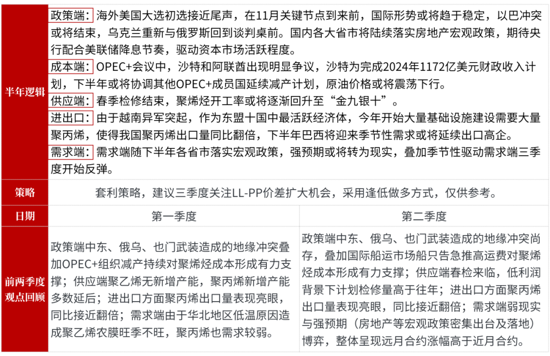 展望下半年,成本端支撑或将松动,盘面交易逻辑回归基本面,供应端压力尚存,需求端宏观预期或将主导整体格局。聚乙烯(L2409)的参考震荡区间为8300-8600,聚丙烯(PP2409)的参考震荡区间为7500-7800。策略上,建议投资者跟踪聚乙烯、聚丙烯投产推迟情况,并在三季度考虑逢低做多LL-PP价差。同时,需警惕原油价格的大幅下跌以及PP出口可能遇到的阻碍等风险因素。