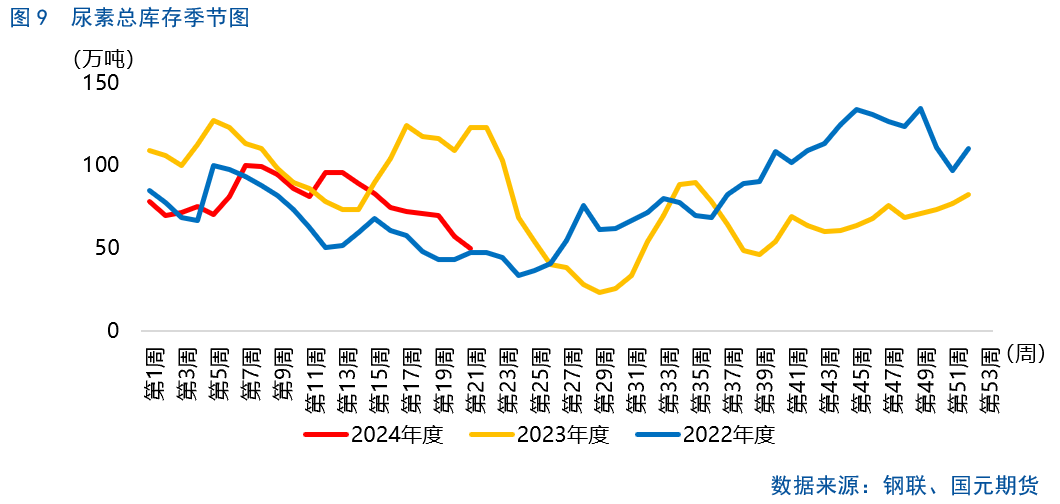 尿素总库存持续下滑,目前接近于近三年同期低位,根据季节性规律,随着夏季施肥旺季到来,尿素厂内库存仍有进一步下滑预期,不过由于出口难以打开,预计港口库存低位波动。截至5月24日,尿素总库存为49.92万吨,环比4月底下降30.91%;尿素港口库存为17.8万吨,环比4月底下降10.55%;尿素厂内库存为32.12万吨,环比4月底下降38.65%。