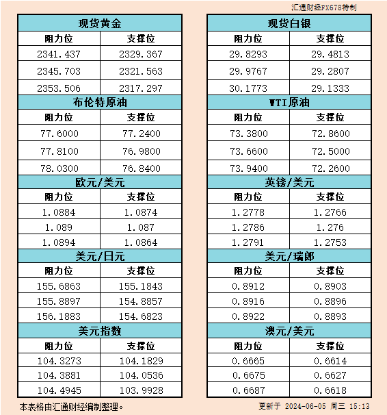 6月5日欧市支撑阻力:金银原油+美元指数等六大货币对