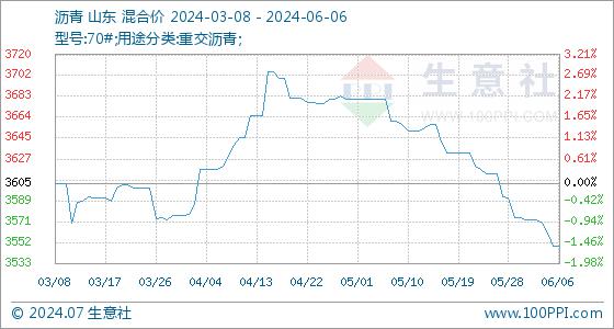 6月6日,生意社沥青基准价为3549.43元/吨,与本月初(3572.29元/吨)相比,下降了-0.64%。