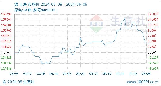6月6日,生意社镍基准价为144016.67元/吨,与本月初(150966.67元/吨)相比,下降了-4.60%。