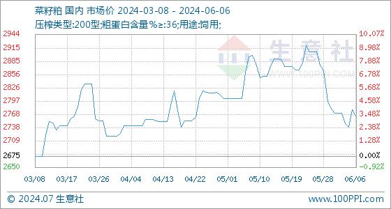 6月6日,生意社菜籽粕基准价为2778.33元/吨,与本月初(2770.00元/吨)相比,上涨了0.30%。
