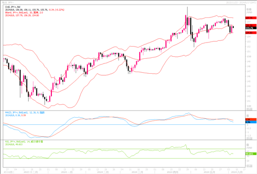 周三(6月5日),美元/日元急升0.8%,至156.09,日元回吐了隔夜大部分涨幅。周三的数据显示,日本4月实质薪资连续第25个月下降,因通胀率高于名义工资增幅。日本央行副总裁冰见野良三周二表示,央行在引导货币政策时,必须“高度留意”日元波动可能对经济和通胀产生的影响。投资者认为,日本央行未来将收紧政策,但尚不足以使日元走强,关键还是要看美元利率年内是否能降息。而周三当天,美国供应管理协会(ISM)称,其非制造业采购经理人指数(PMI)从4月份的49.4升至上个月的53.8。5月份读数为8月份以来最高,并超过了预期的50.8。全球最大经济体美国的服务业活动在前一个月萎缩后,5月份出现反弹,凸显了美联储今年晚些时候启动宽松周期的不确定性。数据出来后,美元指数上涨0.1%,报104.28。目前市场目光聚焦在周五美国的非农数据,以期窥得美联储未来的货币政策路径。日线图上,美元/日元尚受压于布林带中轨线之下,技术指标下顷趋向未有改变。日内预料该货币对不易上穿布林带中轨线水平156.30阻力。在周五美国非农数据出炉之前,预料美元/日元波动范围限于154-156.30之间。
