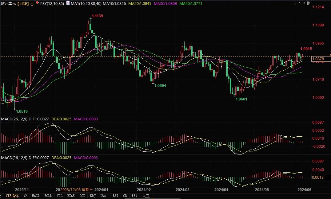 北京时间6月6日14:25,欧元兑美元报1.0879