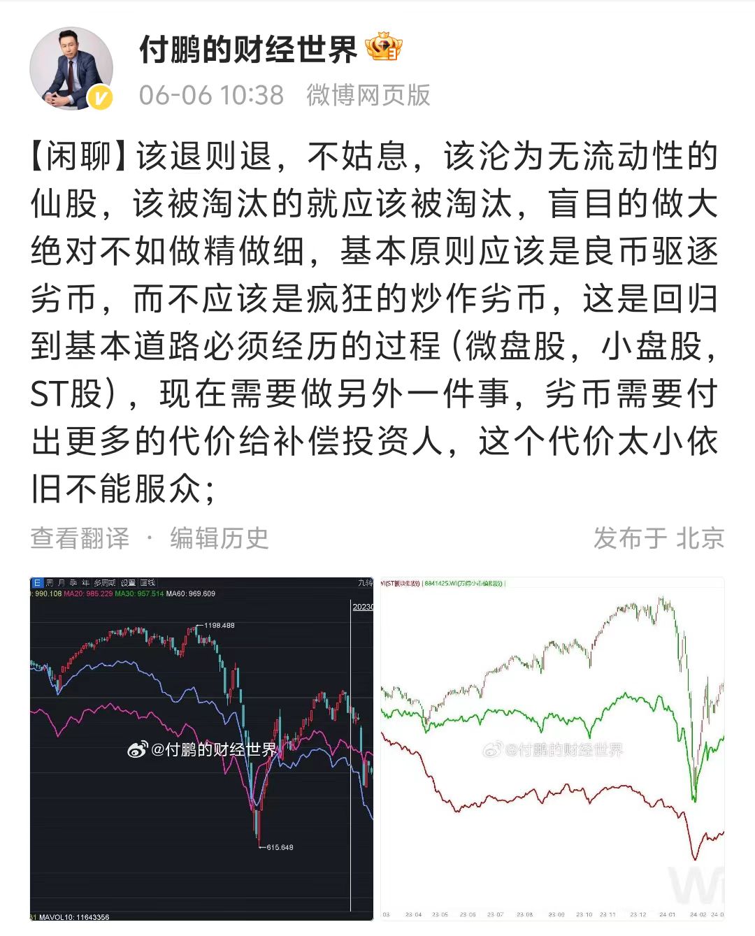 东北证券首席经济学家付鹏6日发文称,该退则退,不姑息,该沦为无流动性的仙股,该被淘汰的就应该被淘汰,盲目的做大绝对不如做精做细,基本原则应该是良币驱逐劣币,而不应该是疯狂的炒作劣币,这是回归到基本道路必须经历的过程(微盘股,小盘股,ST股),现在需要做另外一件事,劣币需要付出更多的代价给补偿投资人,这个代价太小依旧不能服众。