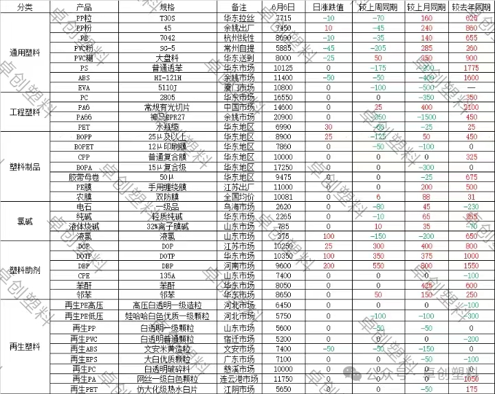 备注:以上表中所取价格为各产品代表市场或是代表区域价格,更多市场价格及详情内容请关注卓创资讯各产品网站或手机客户端。