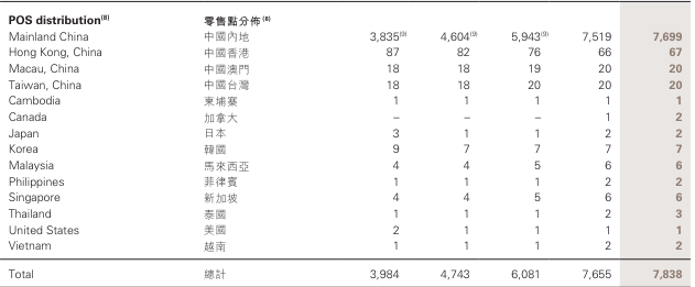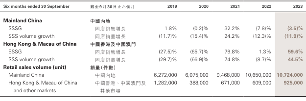 不过,港澳门店虽少,但是店均销量能力力压内地门店。从财报来看,2024年4月-9月,内地店均销量为1393件,而港澳门店店均销量达10632件,是内地门店的7.6倍。