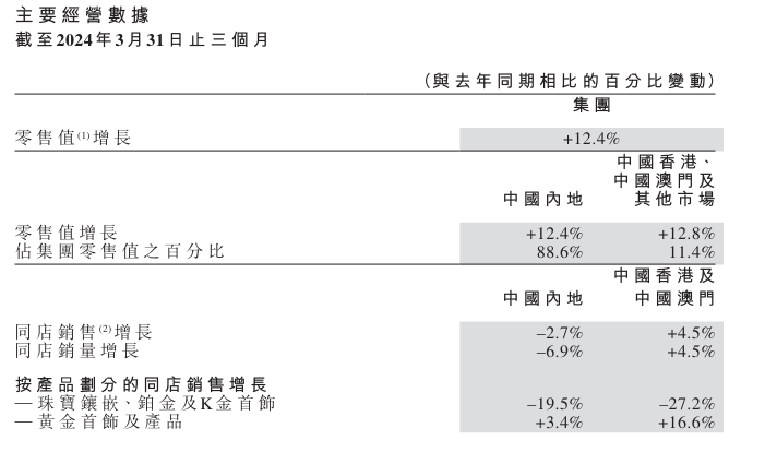 今年4月,周大福发布一季度业绩,2024年前3月,周大福集团零售值增长12.4%,但是内地的同店销售和销量均有不同程度下滑。