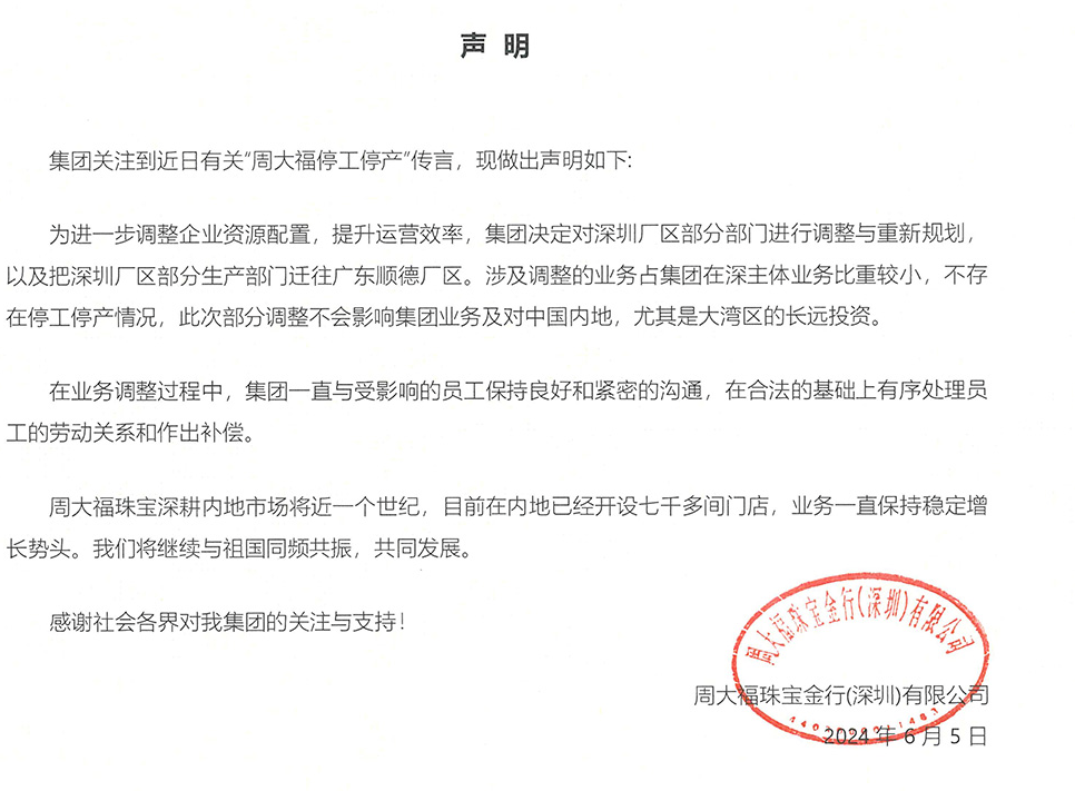 (周大福有关深圳工厂业务迁移的声明;来源:周大福官网)