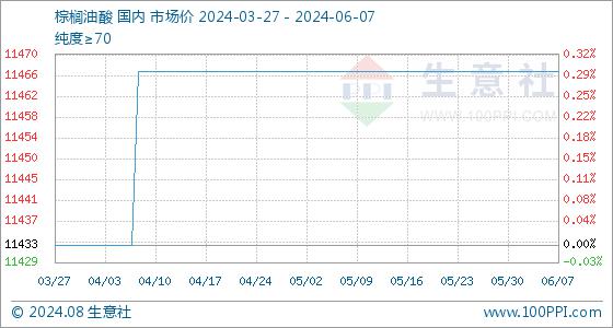 6月7日,生意社棕榈油酸基准价为11466.67元/吨,与本月初持平。