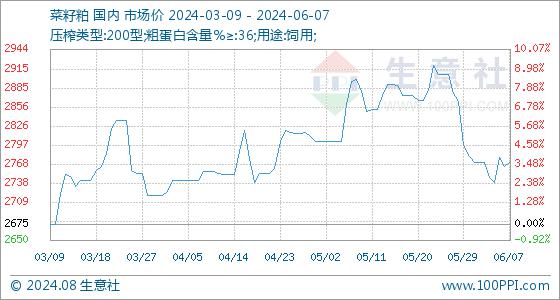 6月7日,生意社菜籽粕基准价为2765.00元/吨,与本月初(2770.00元/吨)相比,下降了-0.18%。