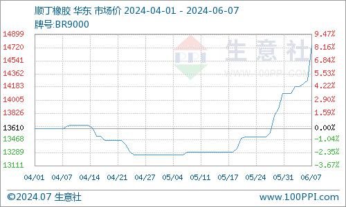 顺丁橡胶现货行情受期货大涨、成本高企、供应偏紧支撑价格冲高,但市场成交清淡。从基本面看,原料丁二烯价格近日再次走高,顺丁橡胶成本面支撑走强;国内顺丁橡胶装置开工整体处5.6成附近低位,顺丁橡胶市场供应面相对偏紧。顺丁橡胶现货价格受成本及供应面支撑较强,顺丁橡胶企业供价陆续上调,进入6月份5个交易日内顺丁橡胶供价两次上调共计500元/吨幅度。7日受期货市场大涨,部分商家报盘跟涨,截至6月7日顺丁橡胶华东地区现货报盘在15200~15600元/吨之间,但下游观望为主,加之临近端午节,市场整体有价无市,部分商家封盘观望。