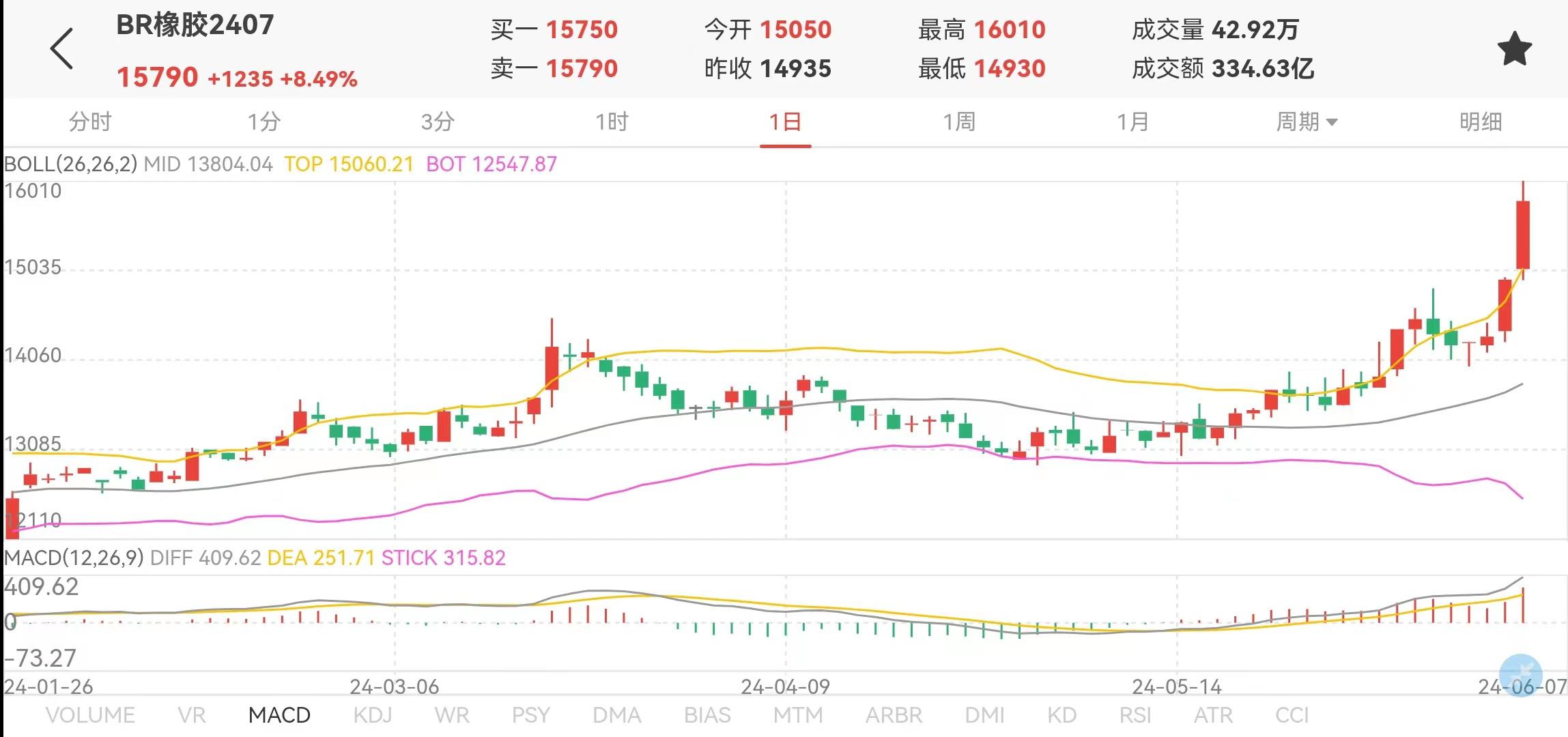 6月7日丁二烯橡胶期货07合约大幅冲高,盘中触及涨停,最高触及16010元/吨。据了解6、7日两个交易日丁二烯橡胶07合约持仓量由1.7万手增仓至3.4万手,价格由6日开盘14375元/吨上涨至7日收盘15790元/吨,涨幅9.84%。