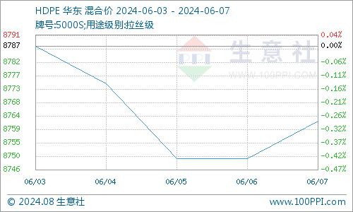 据生意社商品行情分析系统监测,HDPE(5000S)6月3日国内价格在8787元/吨,6月7日均价在8762元/吨,期间报价下跌幅度0.28%。