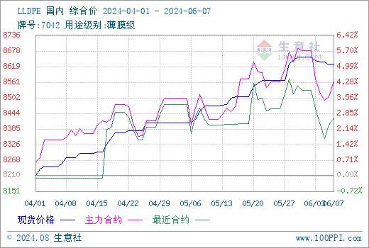 6月7日,大连商品交易所聚乙烯l2409合约,开盘价8528元,收盘价8544元,涨38元,最高8609元,最低8523元,涨0.45%。本周聚乙烯期货先走弱,临近周末,小幅上涨。