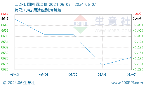 据生意社商品行情分析系统监测,LLDPE(7042)6月3日国内价格在8642元/吨,6月7日均价在8628元/吨,期间报价下跌幅度0.17%。