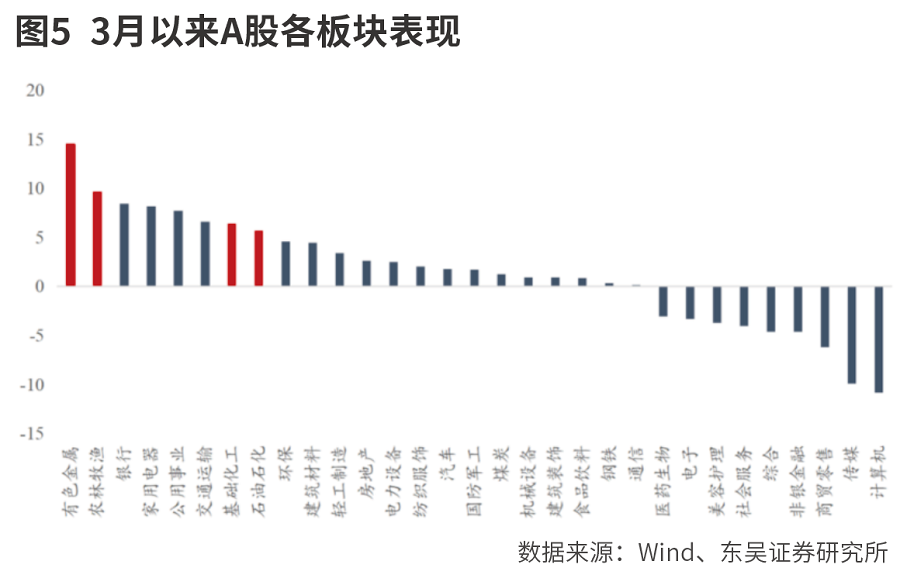 3月以来,A股涨幅最好的就是有色金属板块,基础化工、石油石化、农林牧渔也表现相对较好,这都与相关大宗商品涨价有密切关系。