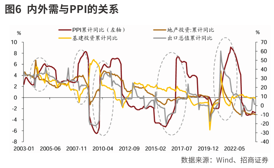内需中对PPI影响较大的是地产和基建投资。2015年之前的五轮PPI上行周期中地产投资增速平均为25.3%,2015年之后的两轮PPI上行周期中地产投资增速平均仅,但基建投资作为政府逆周期调节手段,与地产投资形成互补。