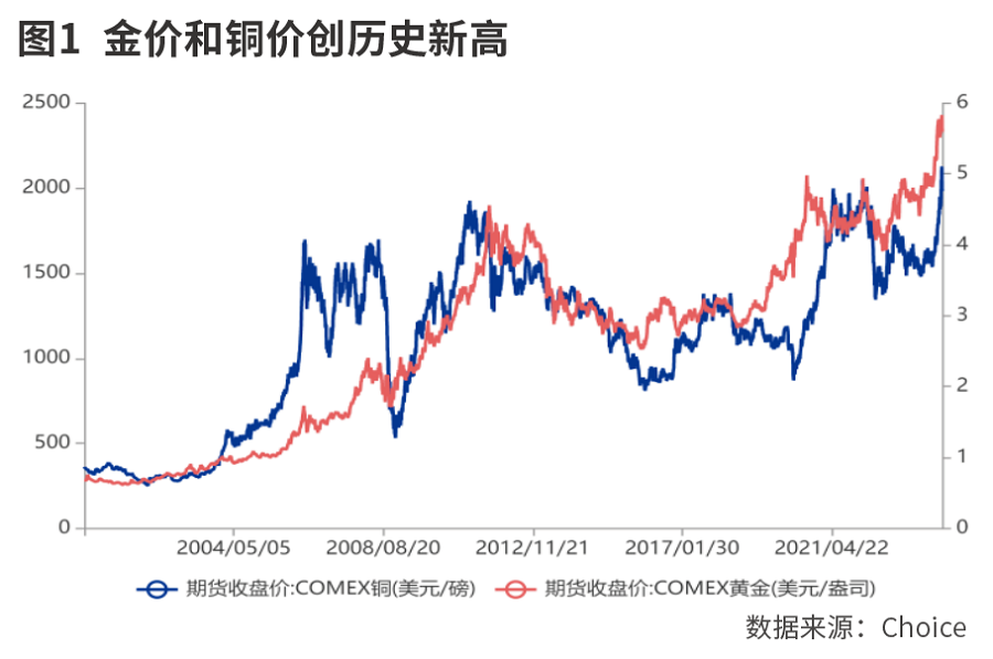 本轮大宗商品涨价中,贵金属中的黄金和有色金属中的铜可谓独领风骚。COMEX黄金价格从2023年10月初的不到每盎司1850美元,一度上涨到2450美元上方,期间涨幅超30%,金价不断刷新历史新高。COMEX铜期货价格2月以来已经大幅上涨了近40%,5月20日更是创下519.9美分/磅的历史新高。