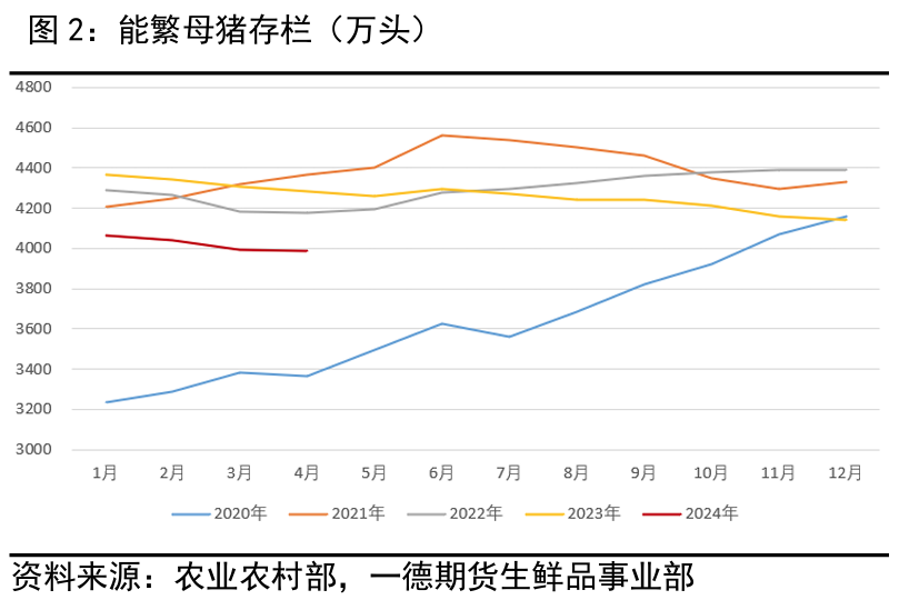 我们对比2022年与2024年生猪出栏量,就要考虑前10个月能繁母猪质与量的表现。对比2021年3月-2022年2月与2023年3月-2024年2月能繁母猪存栏发现,本轮周期中母猪存栏量绝对值明显低于2021-2022年同期,母猪存栏去化幅度上相差不大。从效率上看,2023-2024年要比2021-2022年高大约7%-8%,对应能繁母猪300万头左右。母猪数量与效率相结合来看,本轮猪周期价格理论上应弱于上轮(即2022年)同期表现。