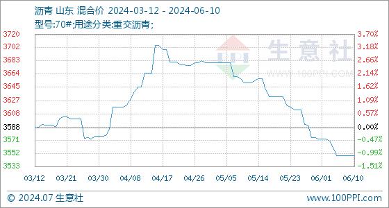 6月10日,生意社沥青基准价为3549.43元/吨,与本月初(3572.29元/吨)相比,下降了-0.64%。