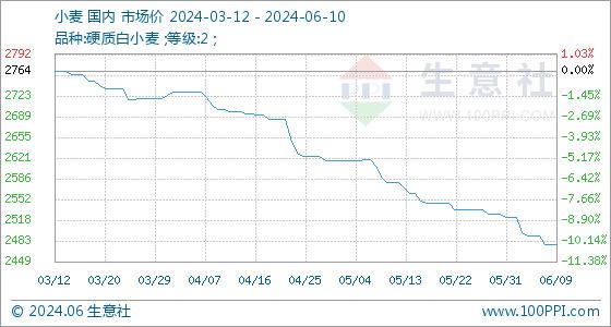 6月10日,生意社小麦基准价为2478.00元/吨,与本月初(2522.00元/吨)相比,下降了-1.74%。