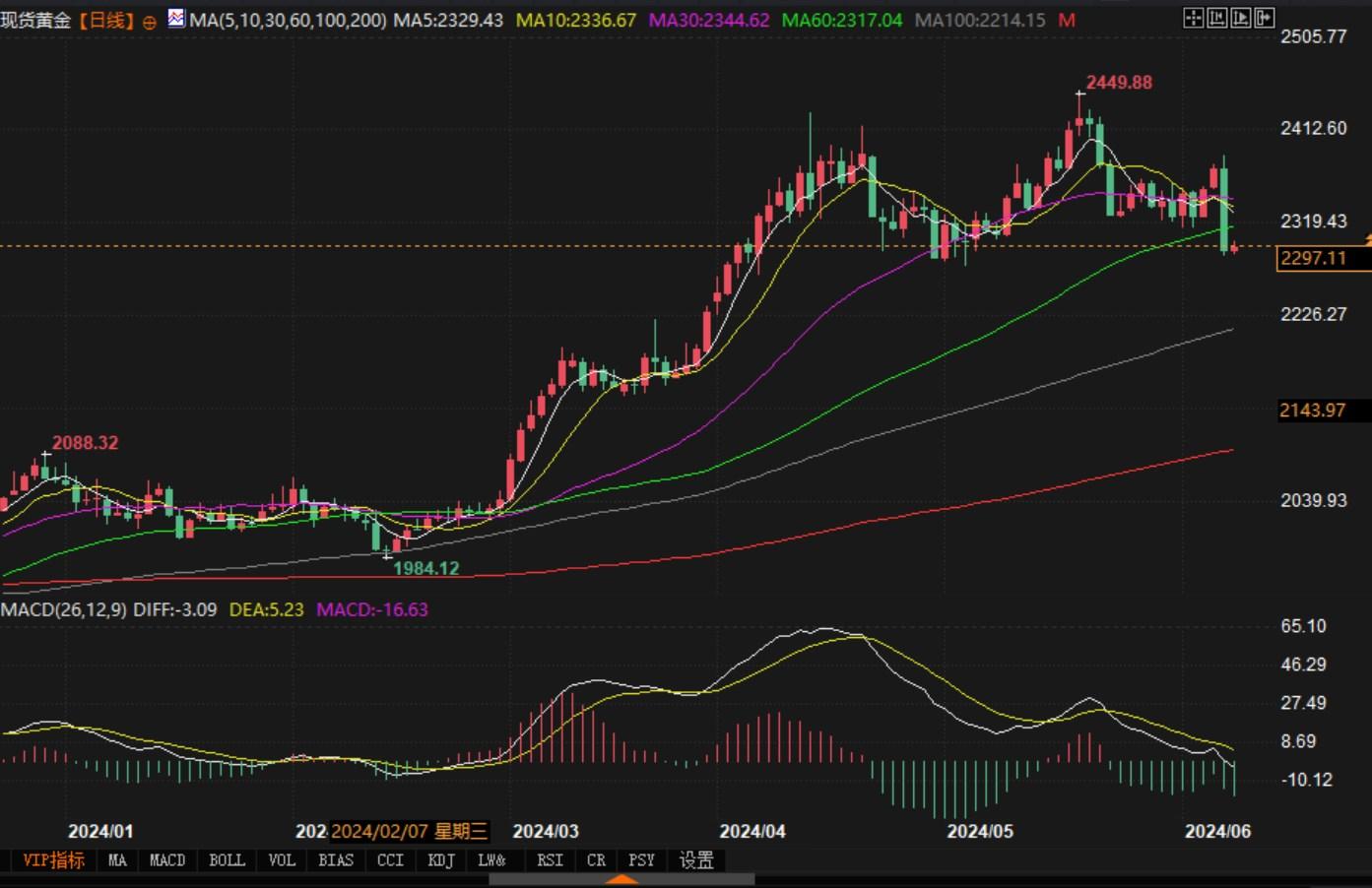 北京时间6月10日10:45,现货黄金报2296.60美元/盎司
