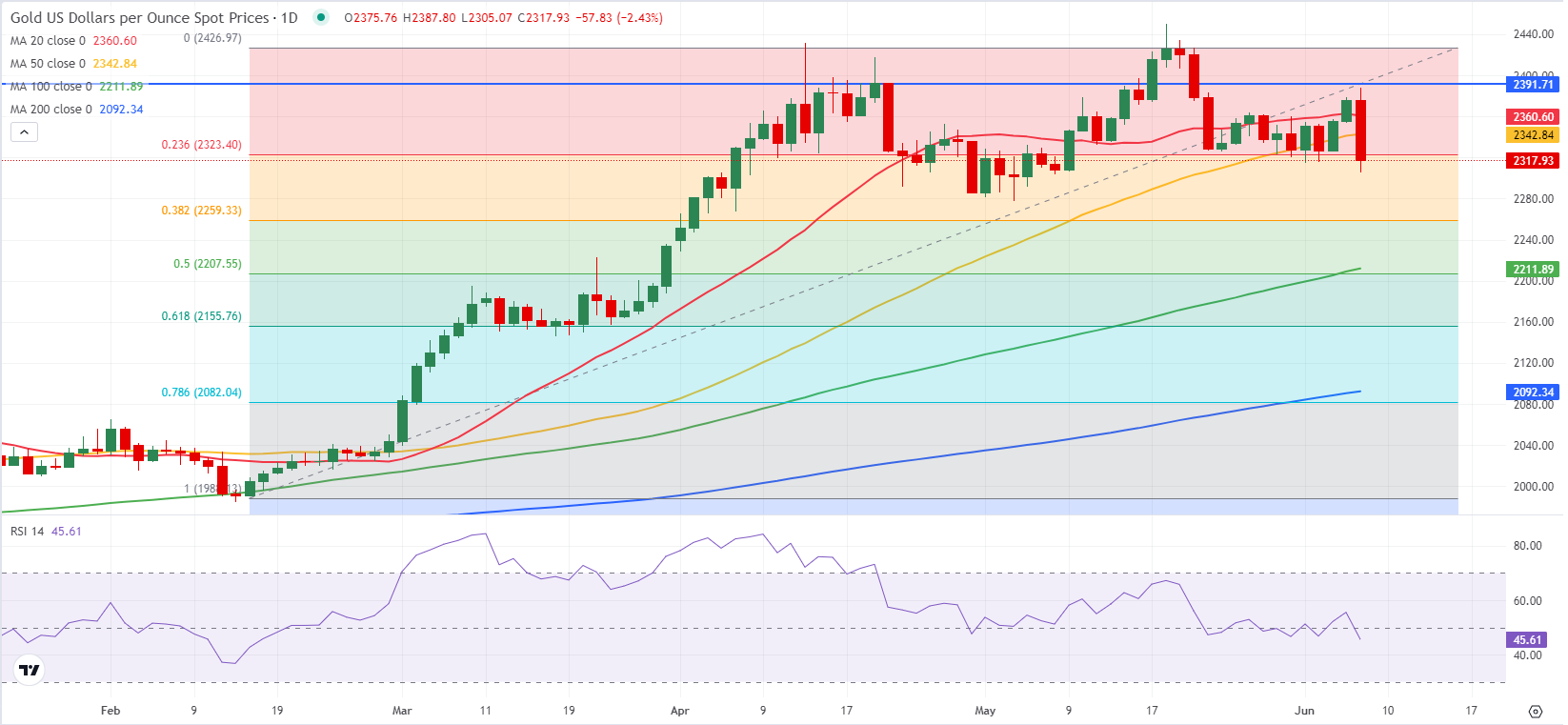 金价已经跌破自2月中旬以来升势的23.6%斐波那契回撤位2320美元/盎司,以及2300美元/盎司心理关口。
