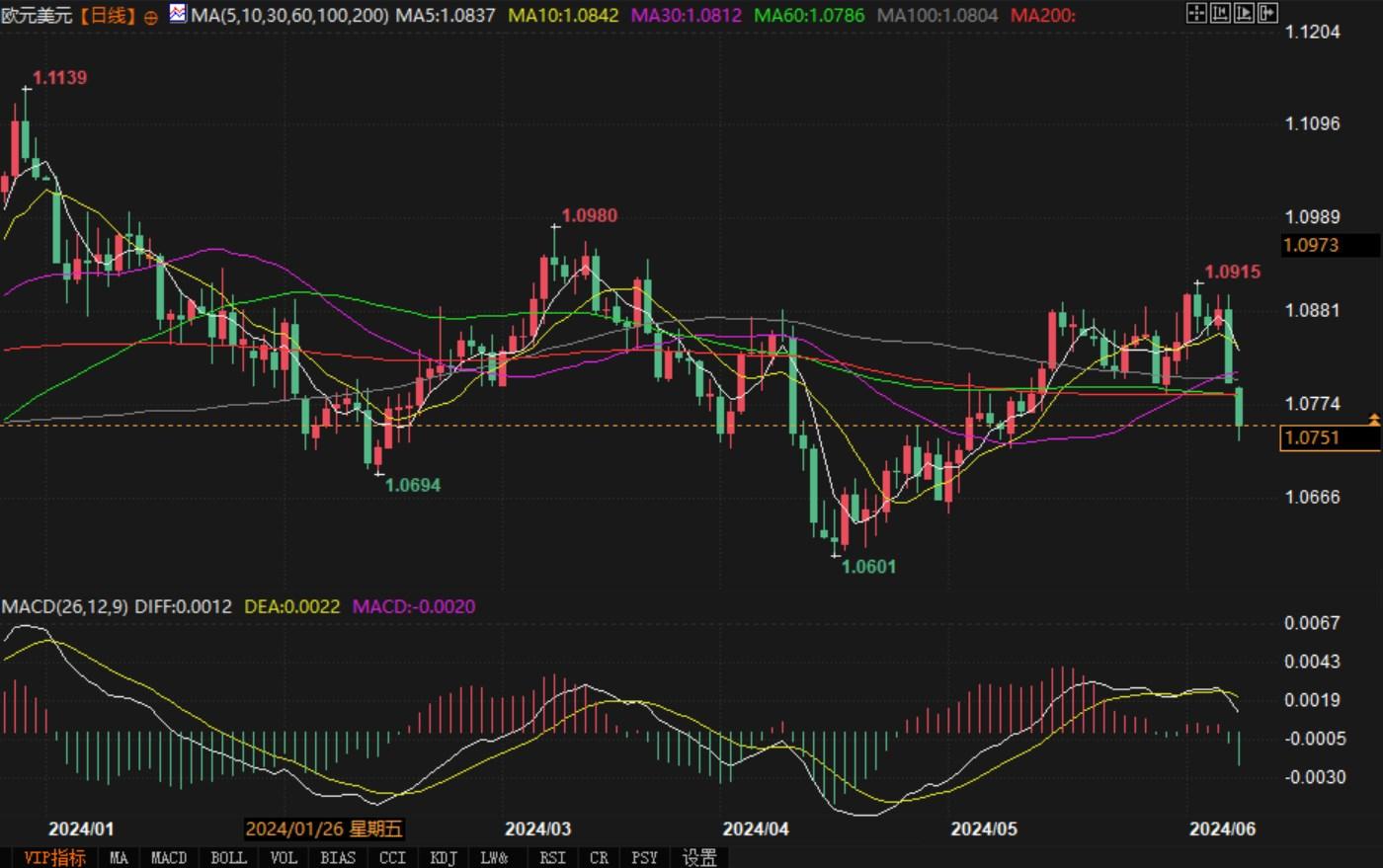北京时间6月10日20:01,欧元兑美元报1.0753/54