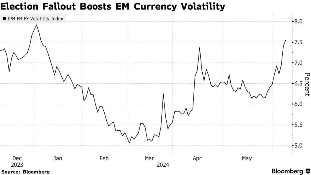 随着极右翼势力在欧洲选举中的崛起,政治风险成为全球关注的焦点。周一,大多数新兴市场货币对美元呈现贬值趋势,市场波动性指标随之上升。匈牙利福林成为当天兑美元和欧元的最大输家之一,特别是在匈牙利在欧洲议会选举中遭遇惨败后,法国总统埃马纽埃尔.马克龙提前宣布议会选举,进一步加剧了市场的不安情绪。受欧元贬值的影响,捷克克朗、罗马尼亚列伊和波兰兹罗提也表现不佳。