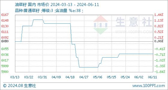 6月11日,生意社油菜籽基准价为6040.00元/吨,与本月初持平。