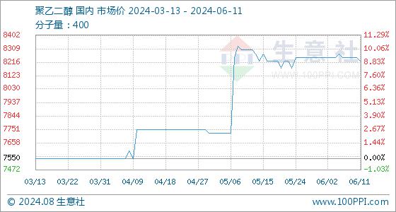 6月11日,生意社聚乙二醇基准价为8250.00元/吨,与本月初持平。