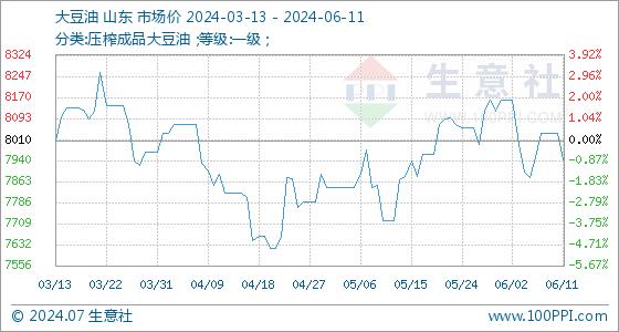 6月11日,生意社大豆油基准价为8040.00元/吨,与本月初(8160.00元/吨)相比,下降了-1.47%。