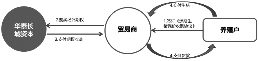 项目具体由生猪贸易商中山智兴与养殖企业茂丰畜牧(珠海农控集团粮油食品出口有限公司子公司)签订《远期生猪保价收购协议》,同时利用看跌期权对冲价格下跌风险,贸易商通过农业保价订单的模式,为养殖企业提供保价服务,分摊价格风险。具体流程如下: