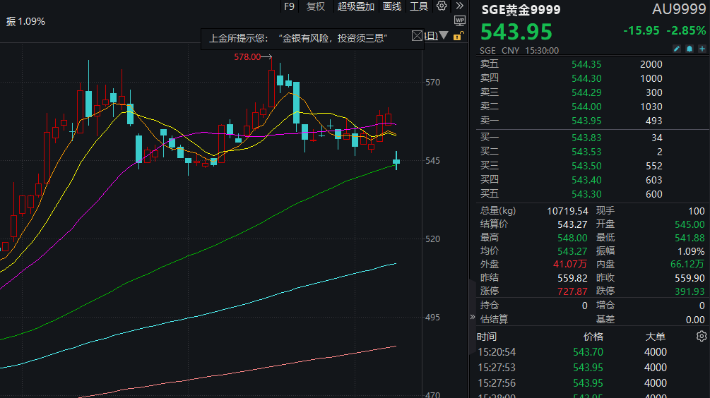 行情数据显示,6月11日当天上海黄金交易所AU9999收盘报543.95元/克,较上一交易日大幅下跌近3%,盘中报价一度跌至近两个月低位。
