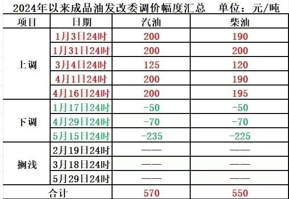截至目前,今年以来,国内油价调整共经历了“五涨三跌三搁浅”,整体涨多跌少,汽、柴油价格每吨较2023年底分别提高了570元、550元。
