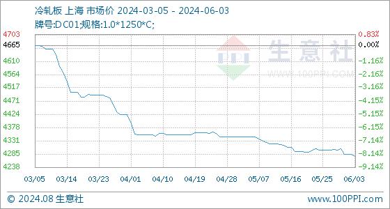 6月3日,生意社冷轧板基准价为4285.00元/吨,与本月初持平。