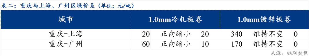 重庆、上海地区冷轧板卷区域价差缩小20元/吨,重庆、广州冷轧板卷区域价差缩小10元/吨;重庆、上海镀锌板卷区域价差维持不变,重庆、广州镀锌板卷区域价差维持不变。镀锌、冷轧品种价差维持不变;镀锌、热轧品种价差缩小20元/吨;冷轧、热轧品种价差缩小20元/吨。