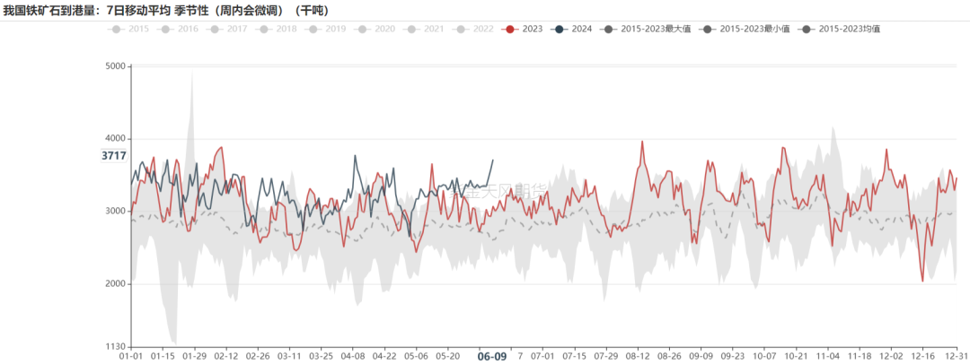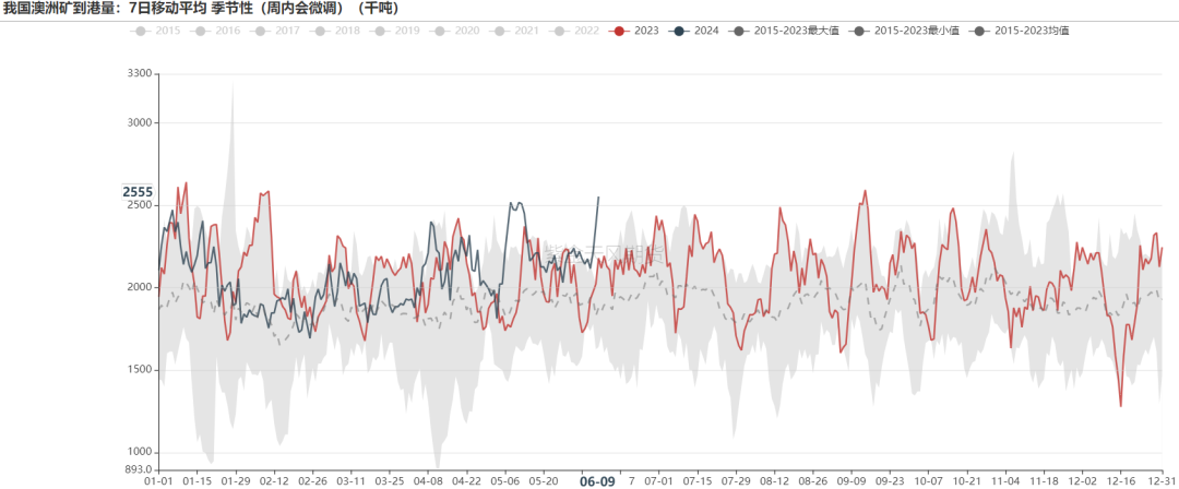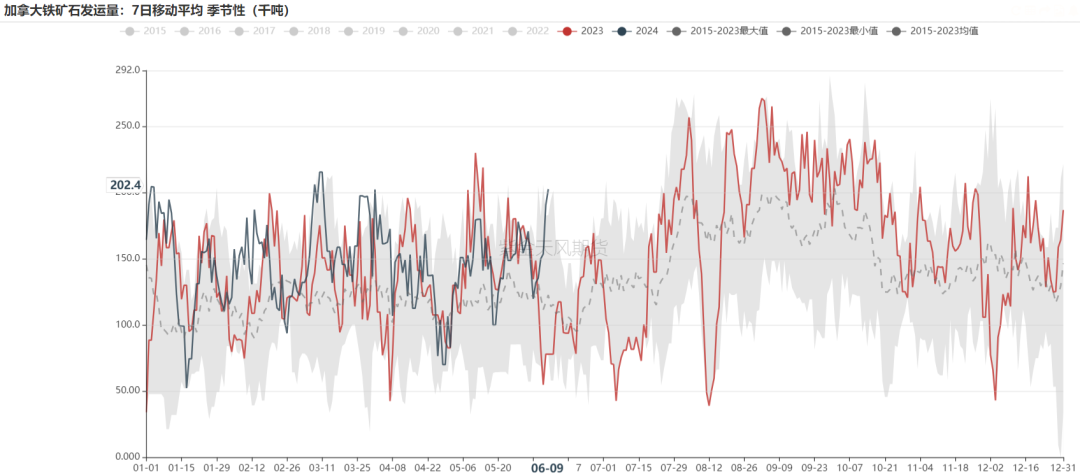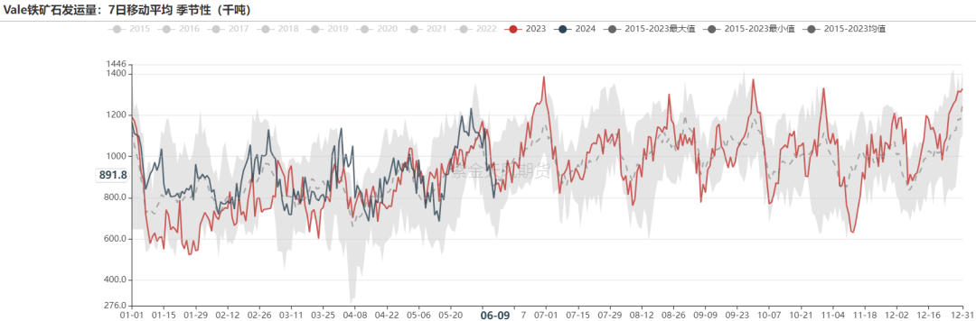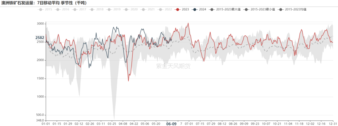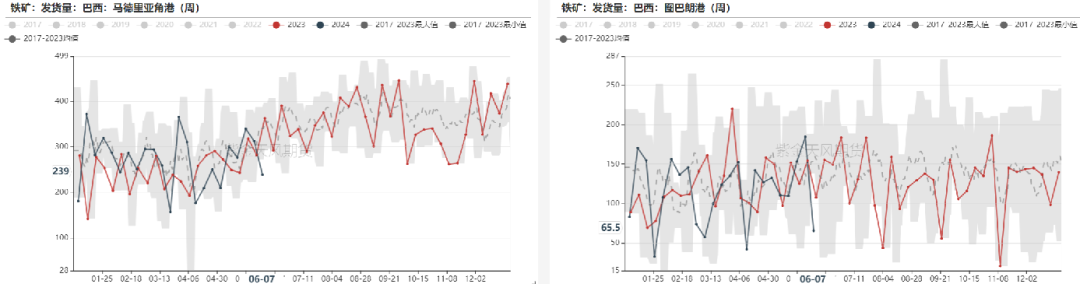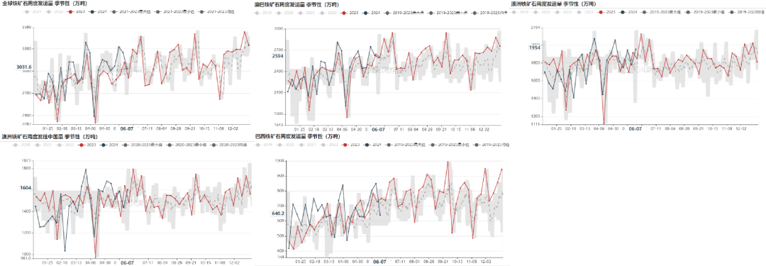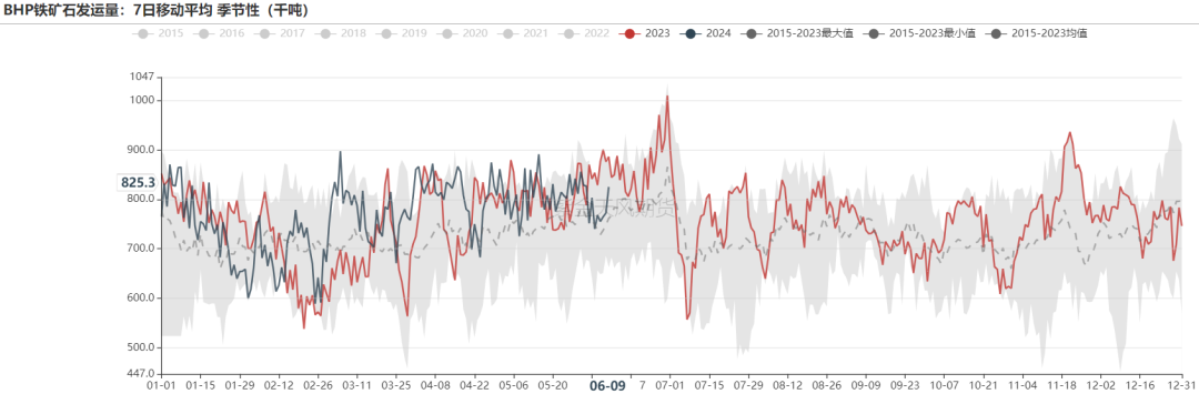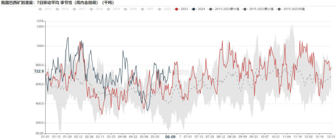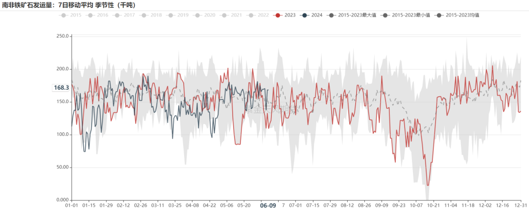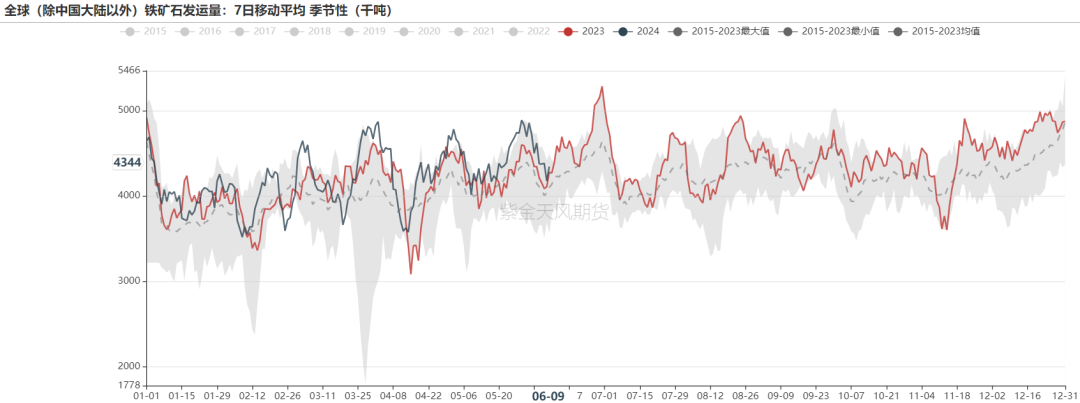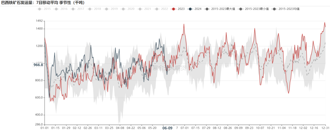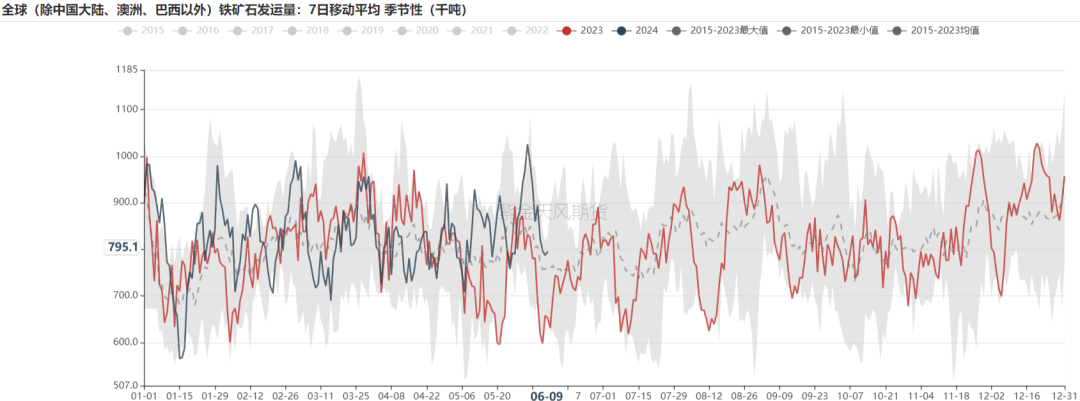 路透口径:2024年6月9日,路透全球铁矿7日移动平均发货量4751千吨,周环比减8.6%,同比增1.6%。澳洲7日移动平均发货量2582千吨,周环比增1.5%,同比持平;巴西7日移动平均发货量967千吨,周环比增20%,同比持平。