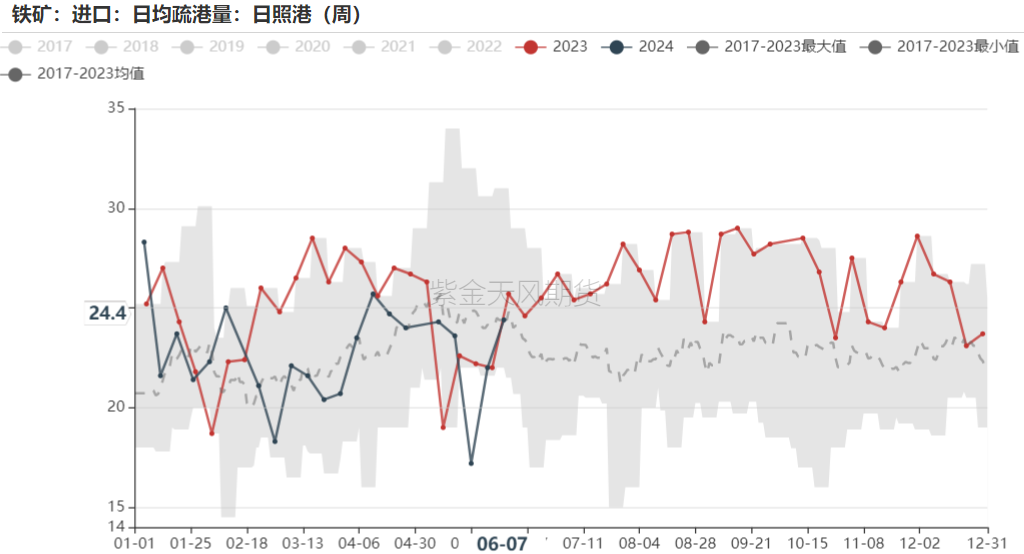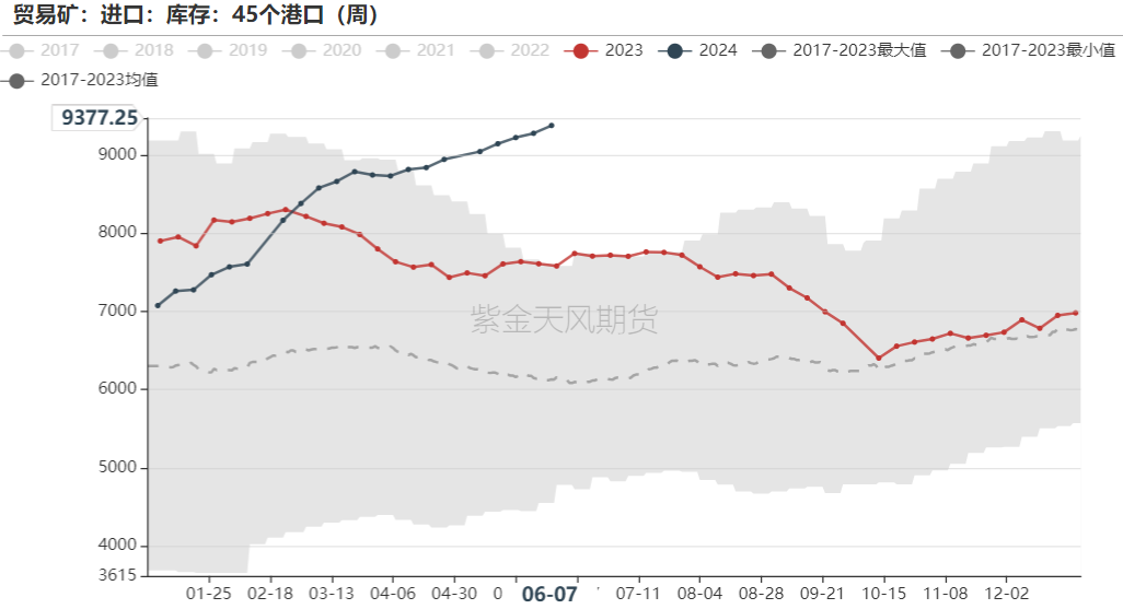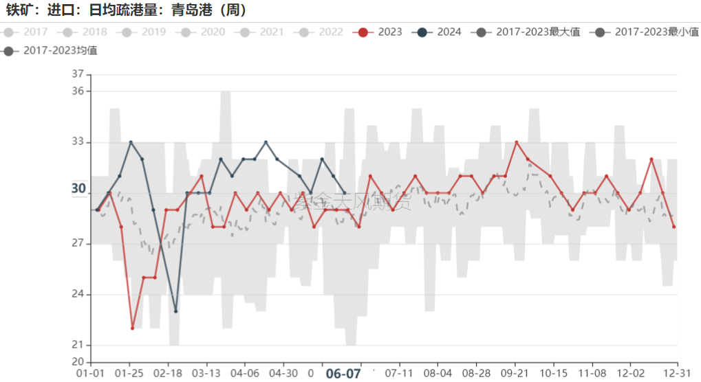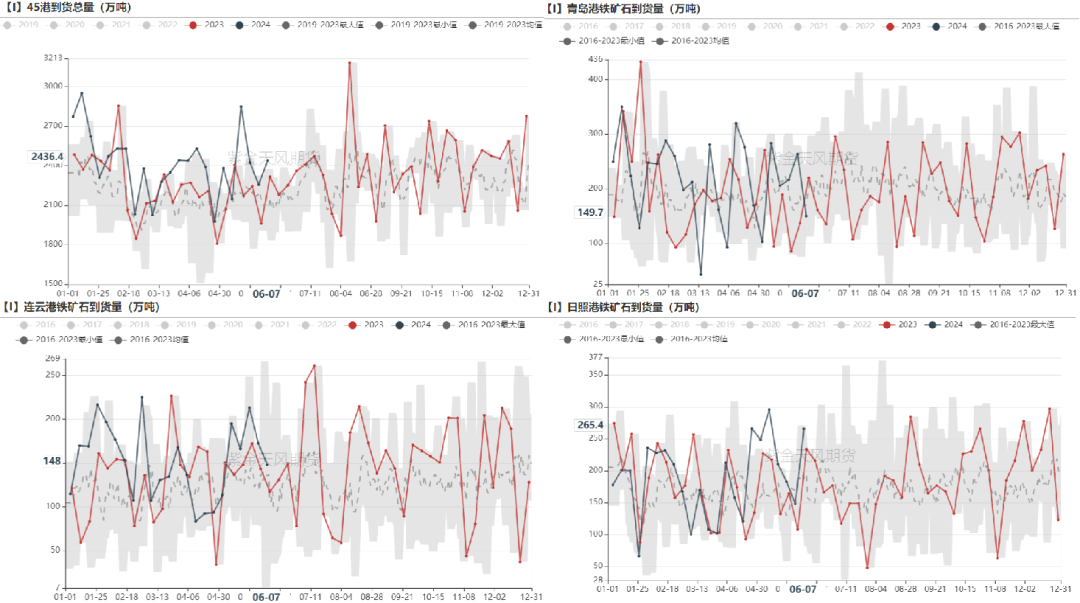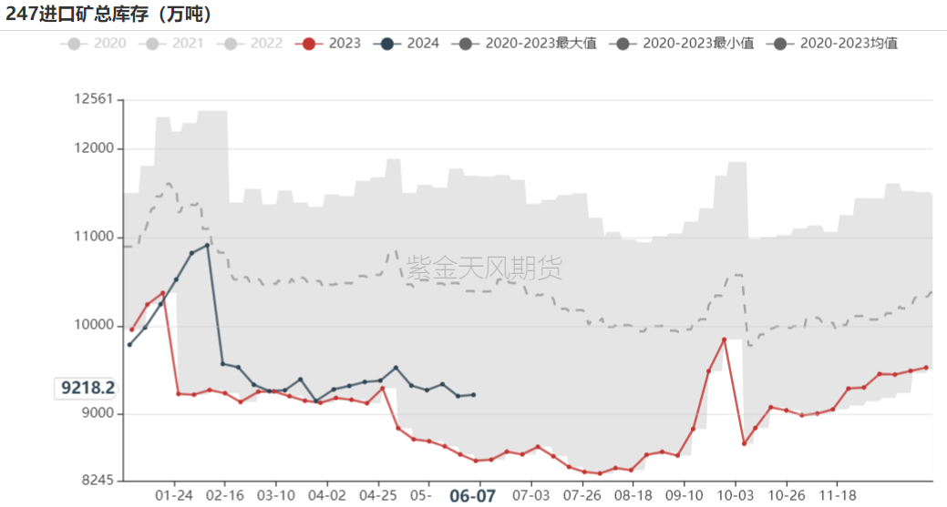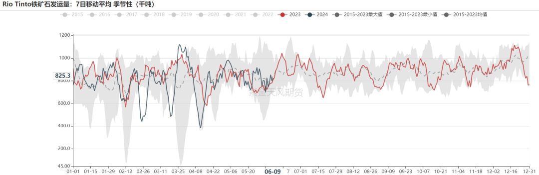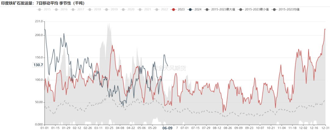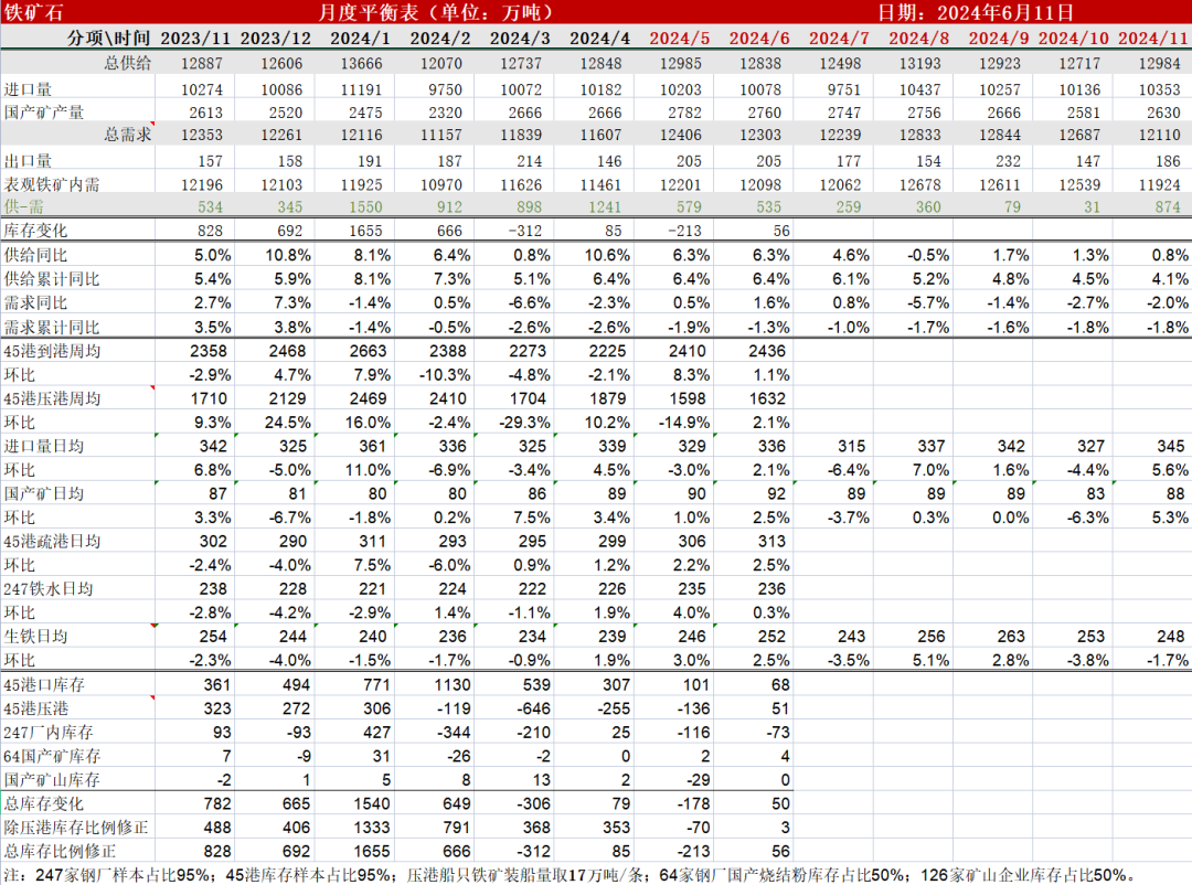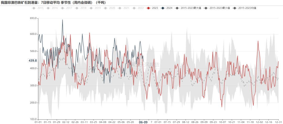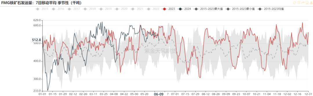 路透口径:2024年6月9日,路透全球铁矿7日移动平均发货量4751千吨,周环比减8.6%,同比增1.6%。澳洲7日移动平均发货量2582千吨,周环比增1.5%,同比持平;巴西7日移动平均发货量967千吨,周环比增20%,同比持平。