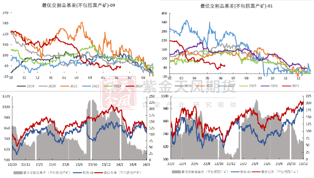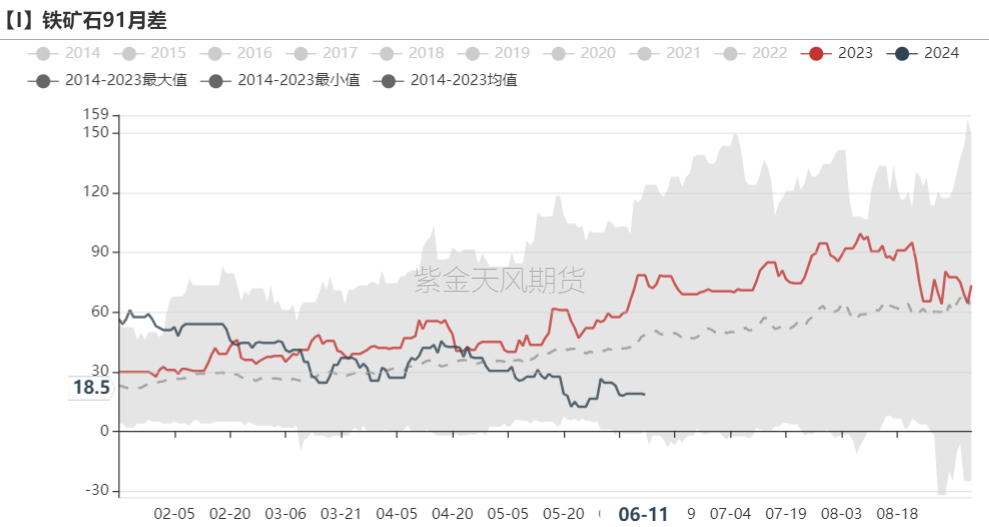 现货铁矿现货成交量上行,09合约基差率4.5%左右,基差环比暂稳,基差率上行。
