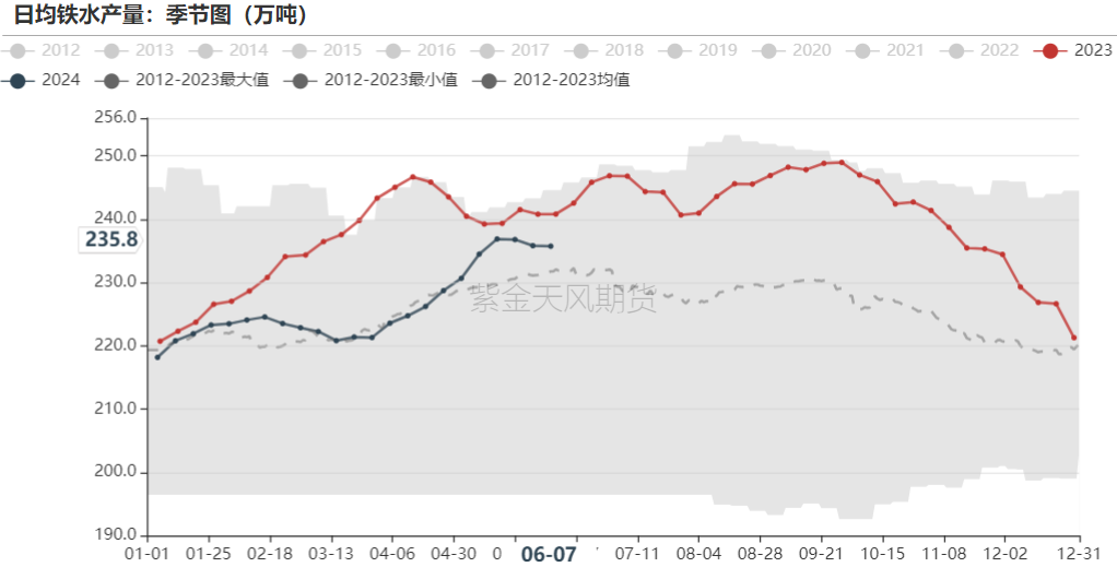 铁水本周钢联公布247样本铁水产量235.75万吨,环比减0.08万吨,6月日均铁水236万吨。