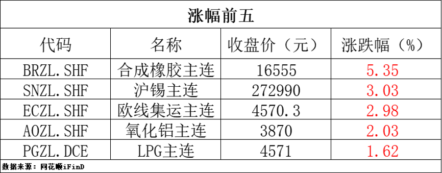 6月12日,国内商品期货多数收涨,合成橡胶涨超5%,沪锡涨超3%,欧线集运涨近3%,氧化铝涨超2%;跌幅方面,胶合板跌超2%,尿素、硅铁、玻璃跌超1%。