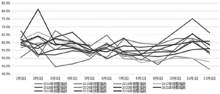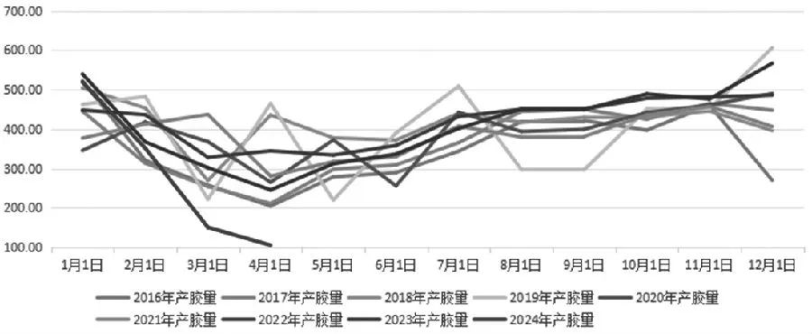 图为2016—2024年泰国月度产胶量(单位:千吨)