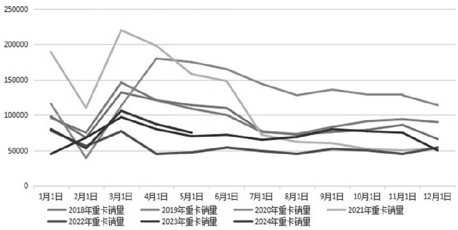 受前期供应链上下游需求集中释放和部分地区需求动力偏弱等因素影响,5月中国物流业景气度指数为51.8%,较4月回落0.6个百分点。物流业景气度和国内重卡运输相关性较高,受此影响,作为天胶需求的“晴雨表”——重卡销量在2024年5月出现同比和环比双双回落的景象。据统计,5月我国重卡汽车销售约7.5万辆,环比大幅下降9%,较去年同期的7.74万辆也小幅下滑了3%。